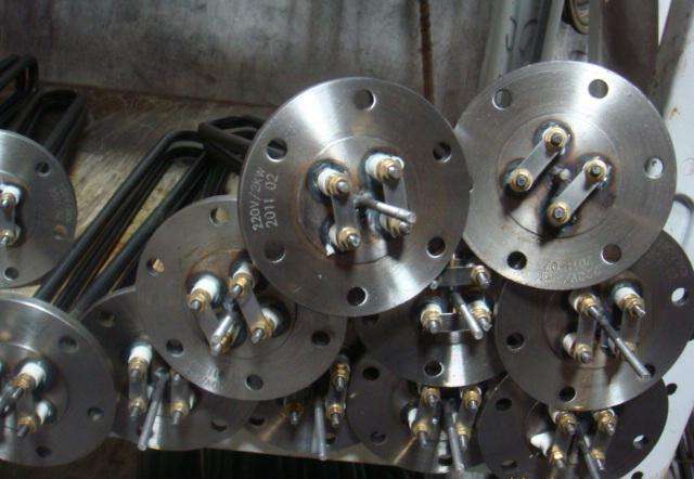 HRY1-護(hù)套式電加熱器(也稱插入式電加熱器):是采用U型管狀電熱元件,依據(jù)加熱不同介質(zhì)設(shè)計(jì)規(guī)范,按照功率配置要求裝配在法蘭蓋上,插入需加熱物料中,發(fā)熱元件工作時(shí)所發(fā)出的大量熱量傳導(dǎo)給被加熱介質(zhì)使介質(zhì)溫度升高,達(dá)到所需的工藝要求。當(dāng)介質(zhì)溫度達(dá)到工藝要求的設(shè)定值時(shí),控制系統(tǒng)根據(jù)溫度傳感器信號(hào),經(jīng)PID運(yùn)算后調(diào)節(jié)電加熱器輸出功率,對(duì)發(fā)熱元件的電阻性負(fù)載實(shí)現(xiàn)溫度控制。使介質(zhì)溫度均勻,達(dá)到所需要求;當(dāng)發(fā)熱元件超溫或低液位時(shí),發(fā)熱元件的聯(lián)鎖保護(hù)裝置立即切斷加熱電源避免發(fā)熱元件燒壞,延長(zhǎng)使用壽命。法蘭式電加熱器是由多支加熱管焊接在法蘭上集中加熱,主要用于敞開(kāi)式、封閉式的溶液箱和循環(huán)系統(tǒng)中加熱用。
